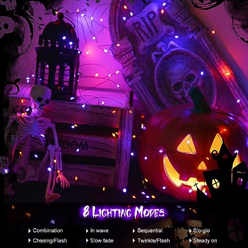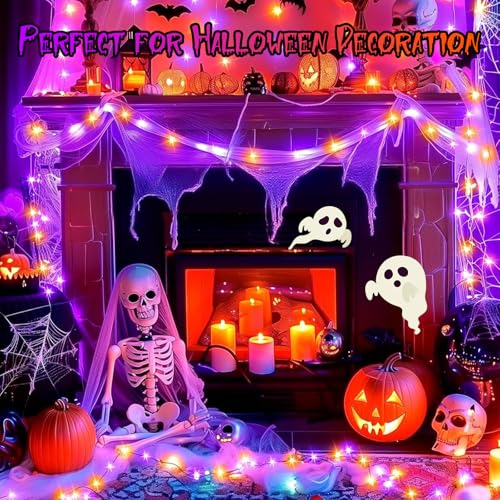 Click for More Images 2 Packs Halloween Fairy Lights: 2 pack 100 LED 33ft purple and orange String Lights is made of flexible silver wire, 4 inch distance between led string lights. The product needs 3AA batteries (batteries not included), the...