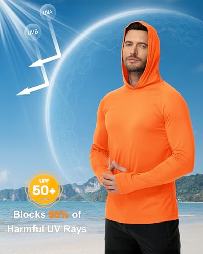 Click for More Images UPF 50+ sun protection, with hood, 4-way stretch, long sleeve with thumb holes, raglan sleeve, printed tag, lightweight, quick dry, breathable, soft and comfortable mens workout clothes[UPF 50+ Sun Protection] UPF 50+ means...