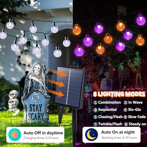 Click for More Images Solar Powered and Automatic ON/OFF: Orange Purple Halloween solar string lights are powered by solar energy, no additional electric cost, and feature an automatic light sensor that turns the outdoor globe solar lights on at...