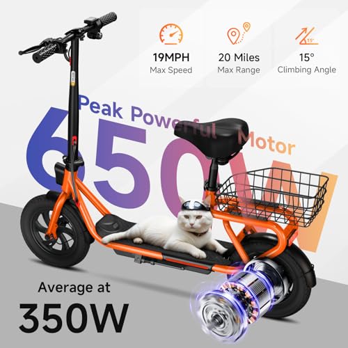 TST Electric Scooter with Seat, Peak 650W Motor 19MPH & 20 Miles Range,12″ Pneumatic Tires, Adults Foldable Commuter Scooter with Basket & Adjustable Seat (12″ Tires-19MPH-With Seat-Orange)