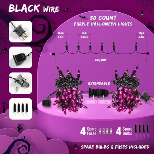Click for More Images ?Black Wire Purple Halloween Lights?:Decorate with Qunlight 50 count purple incandescent lights for the coming Festival.Which includes 1x13FT mini string lights,and each pack with 4 Extra Bulbs & 4 Spare Fuses.Better...