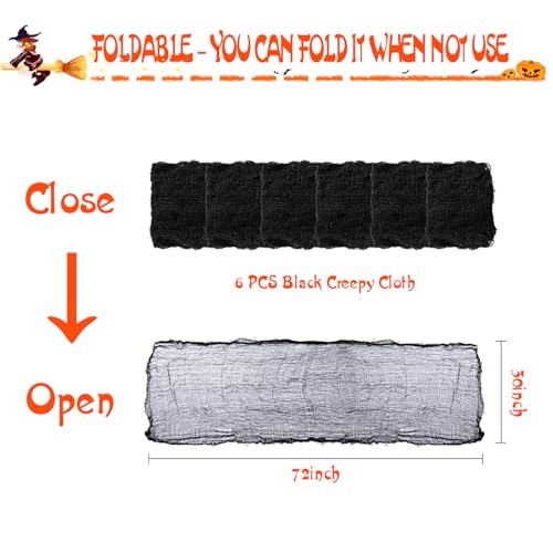 Click for More Images What You Will Get: You will get 6 pack black creepy cloth. When open the halloween gauze, it can reach 72 inch long and 30 inch wide size. You can also fold it when not use, save sapce and easy to storage.Super Soft...