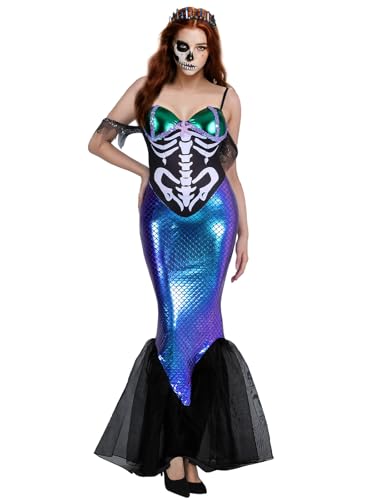 Click for More Images ? Complete Set – Includes mermaid skeleton dress with iridescent tail and a matching headband???? Spooky Mermaid Style – Rib cage skeleton print meets shimmering blue-purple mermaid tail? Flattering Fit – Stretchy,...