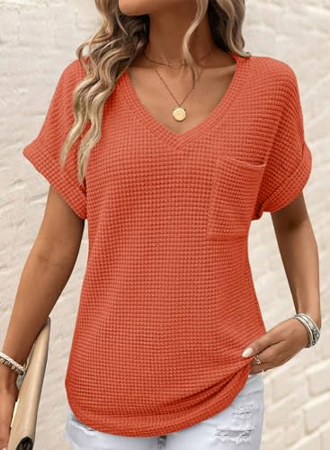Click for More Images material:Women's Waffle Knit Tops is made with lightweight and soft material, which are smooth, elastic and stretchable, it's very light and breathable, comfortable to wear.Feature: Waffle knited Short Sleeve Tops for Women,...