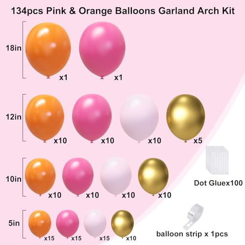 Click for More Images ?Different Size Pink Orange Balloons Arch Kit? The hote pink orange and gold balloon garland arch kit includes 134pcs different sizes of hot pink balloons (18in*2, 12in*10, 10in*10, 5in*15), light pink balloons (12in*10,...