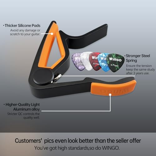WINGO Guitar Capo for Acoustic and Electric Guitars with 5 Picks for Free, Black with Orange Rubber.
