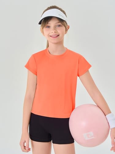 Click for More Images Material: Girls' short sleeve athletic t-shirt is made of soft and breathable yoga fabric, ultra-stretch and comfortable. Loose silhouette offers a cozy wearing experienceDesign: Cute shirts for kids feature pleated back...