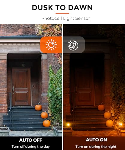 Click for More Images ?Halloween Decorations: 2 Pack 5W LED spot light emits an eerie orange light for a spooky Halloween atmosphere. Especially for Halloween decorations, yard or lawn tree house decorations.?Auto ON/OFF Landscape Spotlight:...