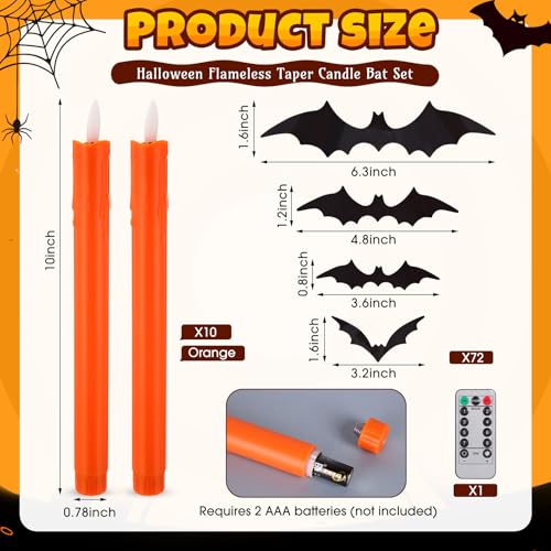 Click for More Images Halloween Bat Electronic Candle Set: you will receive 10 pcs 10 inches orange electronic candles and 72 pcs black bats, this set comes with 1 pcs remote control, 2pcs AAA batteries are needed, you need to buy it by yourself,...