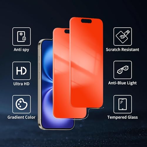Click for More Images [Compatible Phone] The gradient privacy screen protector tempered glass compatible with iPhone 16 pro 6.3 inches (2024) only.[Dynamic Red-Orange] Experience a captivating light reddish-orange color on the screen protector...