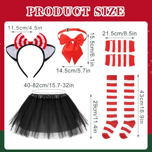 Ahzemepinyo 5 Pack Cat Costume Accessory Kit With Tulle Tutu Skirt Red Striped Knee Length Socks Arm Warmer Cat Ear Headband Bowtie for Cosplay