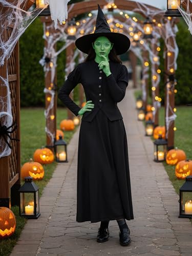 Wicked Costume Women Set with Hat & Glasses Features: Black Dress for Halloween Cosplay, Hat & Glasses,On Halloween or costume parties, wearing the cloak with hat, you are the coolest and most mysterious existence in the darkness!