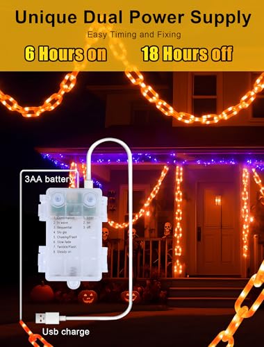 ?8 Modes with Timer and Memory Function?:**Select from unique Halloween chain designs with eight lighting modes (chase, flash, fade, etc.)These battery-operated Halloween lights feature a built-in timer that automatically runs for 6 hours ON and 18 hours OFF daily to conserve energy. Memory function allows you for remain prefered lighting without reset the everytime.