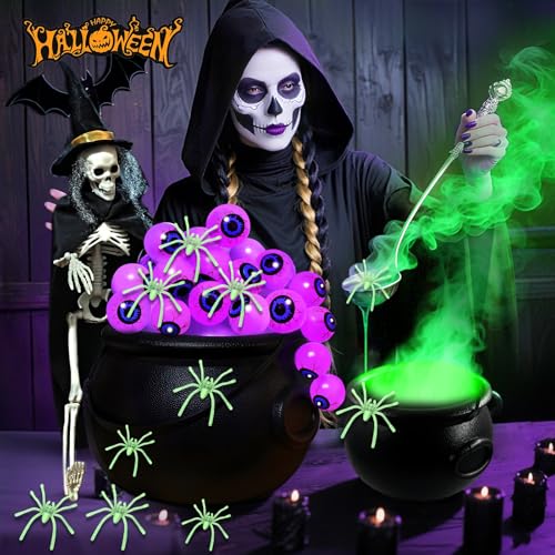 • ?Complete DIY Witch Cauldron Set?You will get everything to create a spellbinding scene: 1 black plastic witch cauldron, 1x 9.84ft purple eyeball LED string lights (20 LEDs), 20 pcs eyeballs, 60g cotton for a smoky effect, 20 fluorescent spiders, 1x 17.7″ poseable skeleton with a wearable cloak and hat, and adhesive dots