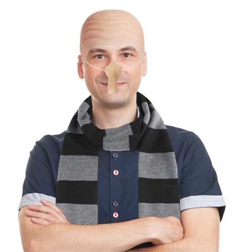 HEYFIZZ 4 Pcs Halloween Costume Accessories for Adult,Black Gray Striped Scarf/Fake Nose/Bald Cap for Men Cosplay Set