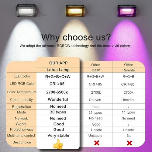 • Super Privacy APP Control?Smart flood lights have strong privacy protection built in.Tired of Wi-Fi issues or a lost remote? Control our outdoor spotlights with the “LotusLamp” app—no registration or internet needed. Just download and start instantly. Enjoy rock-solid signal stability for group control, beyond remotes and Wi-Fi.