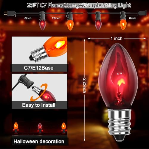 Vibrant Orange and Purple Bulbs: C7 halloween decorations string lights featuring a captivating mix of 25 orange and purple bulbs, creating a striking visual contrast that is sure to catch the eye and elevate the atmosphere, Each bulbs 1W, C7 flame bulbs with E12 base, halloween flickering lights perfect for illuminating your outdoor space during Halloween festivities.