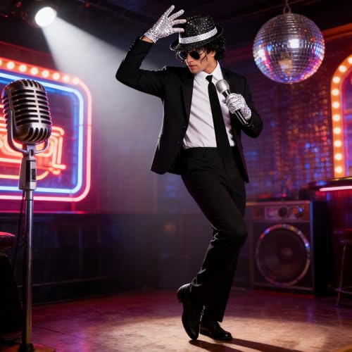 • Premium & Durable Materials -High-quality sequined fabric (hat/gloves) for shine and durability. Soft synthetic fiber wig for realism; sturdy, lightweight tie and sunglasses. Skin-friendly, comfortable for all-day/night performances or parties.