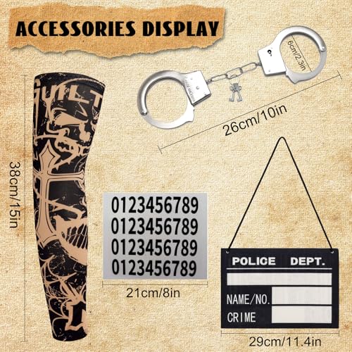 • Prisoner Jumpsuit Set Include:1*orange prison jumpsuit,1* handcuffs,2 * tattoo arm sleeves,1*number stickers,1*nameplates.Perfectly recreate the prison style of prisoners.Tattoo Sleeves are excellent accessories for daily life,parties,halloween,night outings,sports,bars,stage performances, etc.