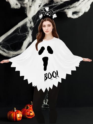 WOLBAY 2Pcs Halloween Costumes Woman Pumpkin Ghost Skeleton Halloween Poncho for Women With Headband (Ghost, Large)