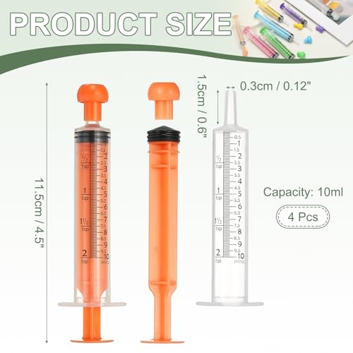 Product Specifications: Material: Plastic; Capacity: 10ml; Total Length: 11.5 cm / 4.5 Inch; Nozzle Length: 1.5 cm / 0.6 Inch; Nozzle Inner Diameter: 0.3 cm / 0.12 Inch; Color: Orange; Packing List: 4 Pcs x Plastic Syringes Pet Feeding
