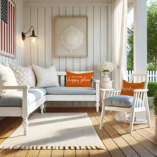 PANDICORN Farmhouse Lumbar Decorative Throw Pillow Covers 12×20 Set of 2 Welcome This is Our Happy Place Orange Outdoor Spring Fall Front Porch Patio Decorations Cushion Cases for Home Couch Decor