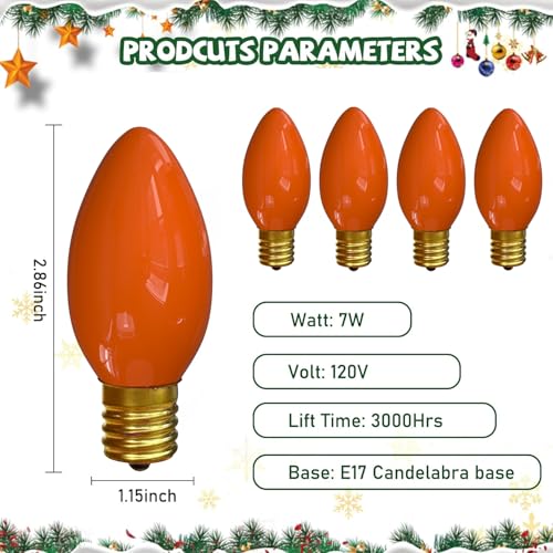 • 25 Pack C9 Christmas Light Bulbs Outdoor: 7 watts per orange bulb, 120 volts power supply. C9 orange Christmas glass bulbs cast warm white light to decorate your Halloween trick or treat outdoor party.