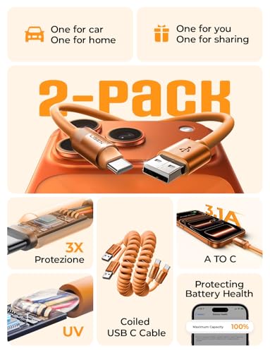 LISEN Coiled USB C Cable, 2 Pack for Android Auto & CarPlay Cable, Short USB A to USB C Cable Compatible with iPhone 17/16/15, Samsung Galaxy S25/S24/S23 A15/A14, Google Pixel 9/8, Orange 4FT